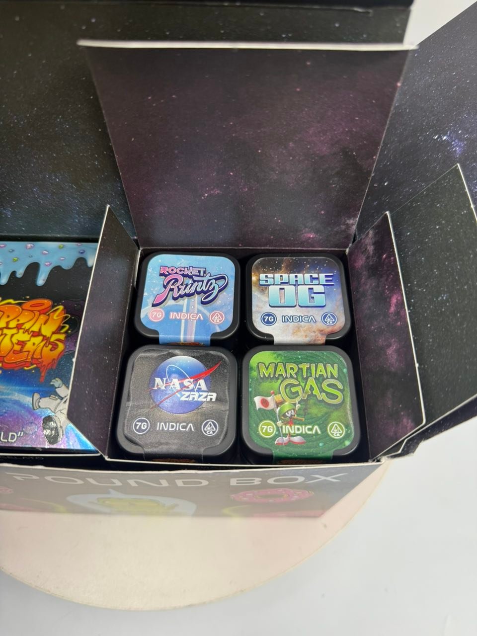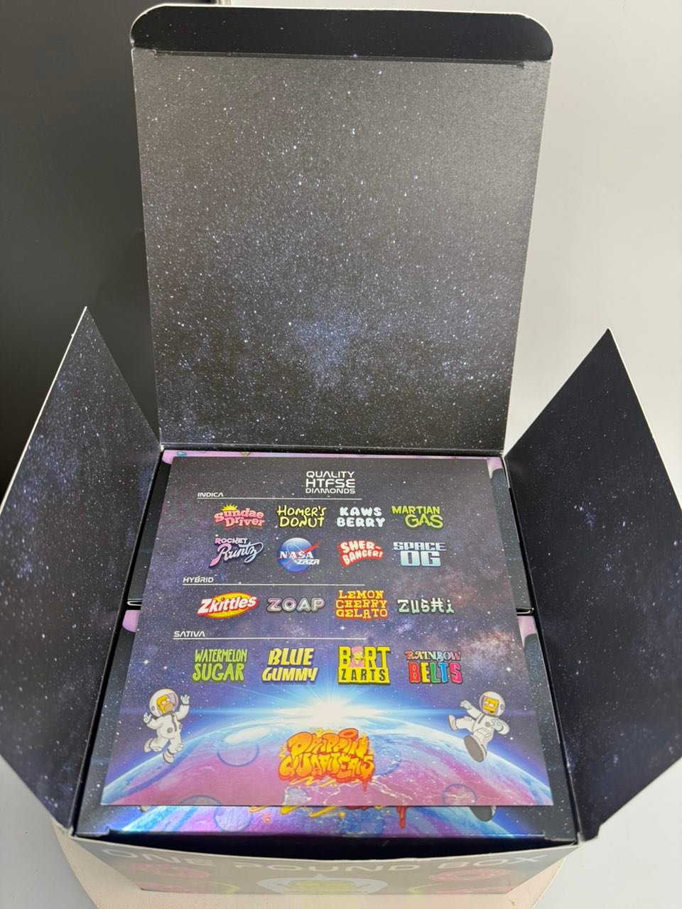 | FLAVORS | SUNDAE DRIVER (INDICA), HOMER'S DONUT (INDICA), KAWS BERRY (INDICA), MARTIAN GAS (INDICA), ROCKET RUNTZ (INDICA), NASA ZAZA (INDICA), SHER-BANGER! (INDICA), SPACE OG (INDICA), ZKITTLES (HYBRID), ZOAP (HYBRID), LEMON CHERR GELATO (HYBRID), ZUSHI (HYBRID), WATERMELON SUGAR (SATIVA), BLUE GUMMY (SATIVA), BART ZARTS (SATIVA), RAINBOW BELTS (SATIVA), 4PK (MIXED FLAVORS) – OZ, 16PK (MIXED FLAVORS) – QP, 32PK (MIXED FLAVORS) – HP, 64PK (MIXED FLAVORS) – 1LBS |